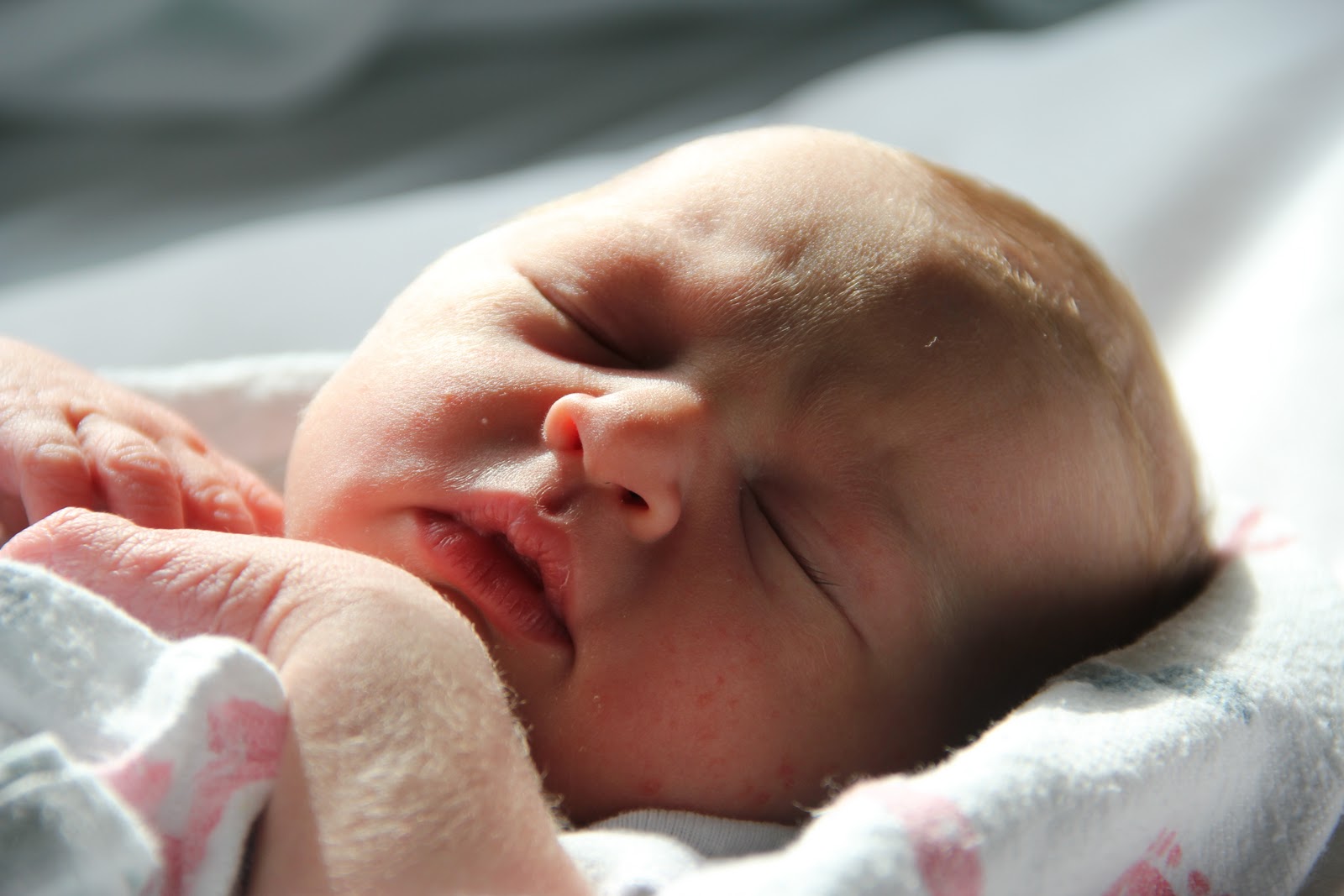 Getting to know our baby girl has been an incredible experience. She is the sweetest, most delicate little person. So far, Evie is one of the most content little babies I've ever seen. Due to her tiny features, small squeaks, and delicate movements, we've taken to calling her "the mouse." The Mouse almost never cries--we only hear small squeaks when we change her diaper or unwrap her blankets. She eats well, but isn't quite as insistent about it as her brother was. Charlie could never relax until he'd eaten as much as possible from both sides. Evie, on the other hand, is happy to relax, cuddle, look around, and enjoy her world a bit before she eats the second half of her meal. We really could not love this girl any more. And because I am so enjoying this sweet little face, I thought I'd share some of my favorite early pics of Evie with you. Here she is on Days 2 & 3 of life!